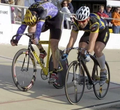 Mark (yellow helmet) sprinting against World and Olympic Champion, Jamie Staff of Great Britian. Photo credit- Clintonphoto.com